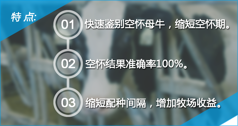 在DG29? 進入中國市場不到兩年的時間里,已經為客戶牧場檢測超過10萬頭份,空懷牛鑒定準確率100%,并發現部分牧場在管理上的潛在風險,真正幫助客戶提高牧場效益,產品得到用戶的高度認可(換句話說就是牧場操作人員用過之后還想再用,因為不僅操作簡單反應快速結果準確而且售后服務也非常好!)。