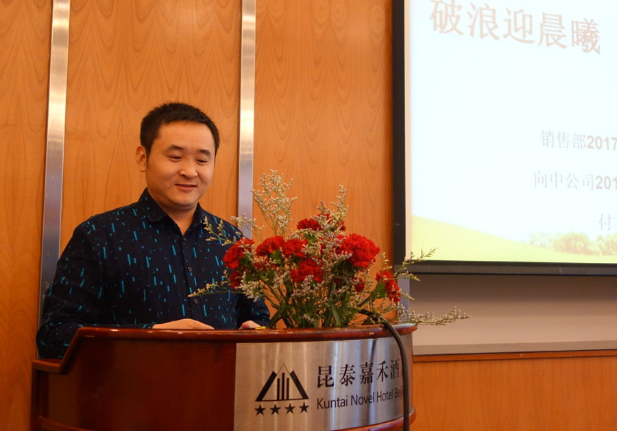 主管銷售和技術(shù)的副總經(jīng)理付豐收先生以“破浪迎晨曦,聚將戰(zhàn)沙場(chǎng)”為主題做了工作總結(jié)和2018年的工作規(guī)劃。他在總結(jié)中肯定了銷售部與技術(shù)部同仁的辛苦努力和業(yè)績(jī)完成情況,對(duì)2018年的銷售目標(biāo)和技術(shù)服務(wù)戰(zhàn)略做出重要部署。