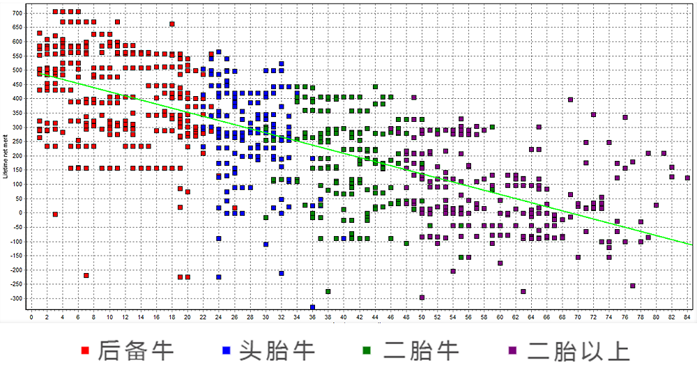 上圖中橫坐標(biāo)為月齡,縱坐標(biāo)為遺傳效益指數(shù),每個(gè)點(diǎn)代表一頭牛,不同顏色代表不同胎次牛。
