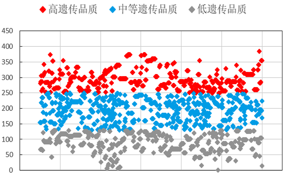 另一方面,在牧場(chǎng)規(guī)模較小的時(shí)候,飼養(yǎng)400頭犢牛和飼養(yǎng)300頭犢牛在管理上的挑戰(zhàn)較小,但是對(duì)于大型牧場(chǎng)來(lái)說(shuō),飼養(yǎng)3000頭犢牛和飼養(yǎng)2000頭犢牛有著本質(zhì)的區(qū)別,對(duì)牧場(chǎng)的管理要求更高。這種情況下牧場(chǎng)又該怎么制定育種規(guī)劃呢?同樣利用優(yōu)選軟件也可以知道牧場(chǎng)全群牛的遺傳品質(zhì)。下圖是牧場(chǎng)牛群遺傳品質(zhì)分布圖。牧場(chǎng)中永遠(yuǎn)都是高遺傳品質(zhì)和低遺傳品質(zhì)的牛各占一部分,大部分牛都屬于中等遺傳品質(zhì)。那么,牧場(chǎng)是否可以選擇牛群中的某一部分牛生產(chǎn)下一代呢?